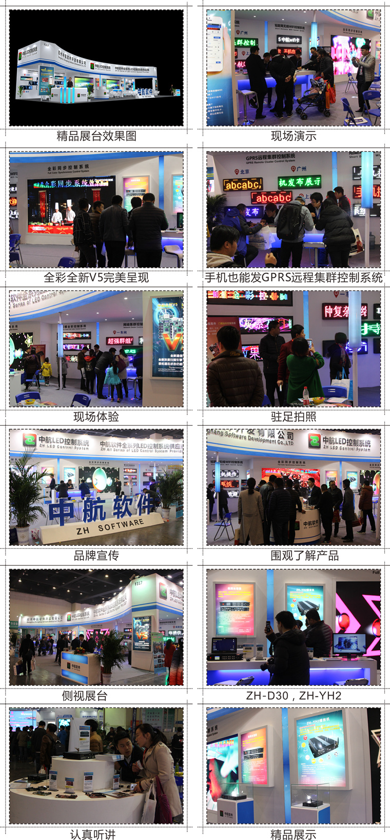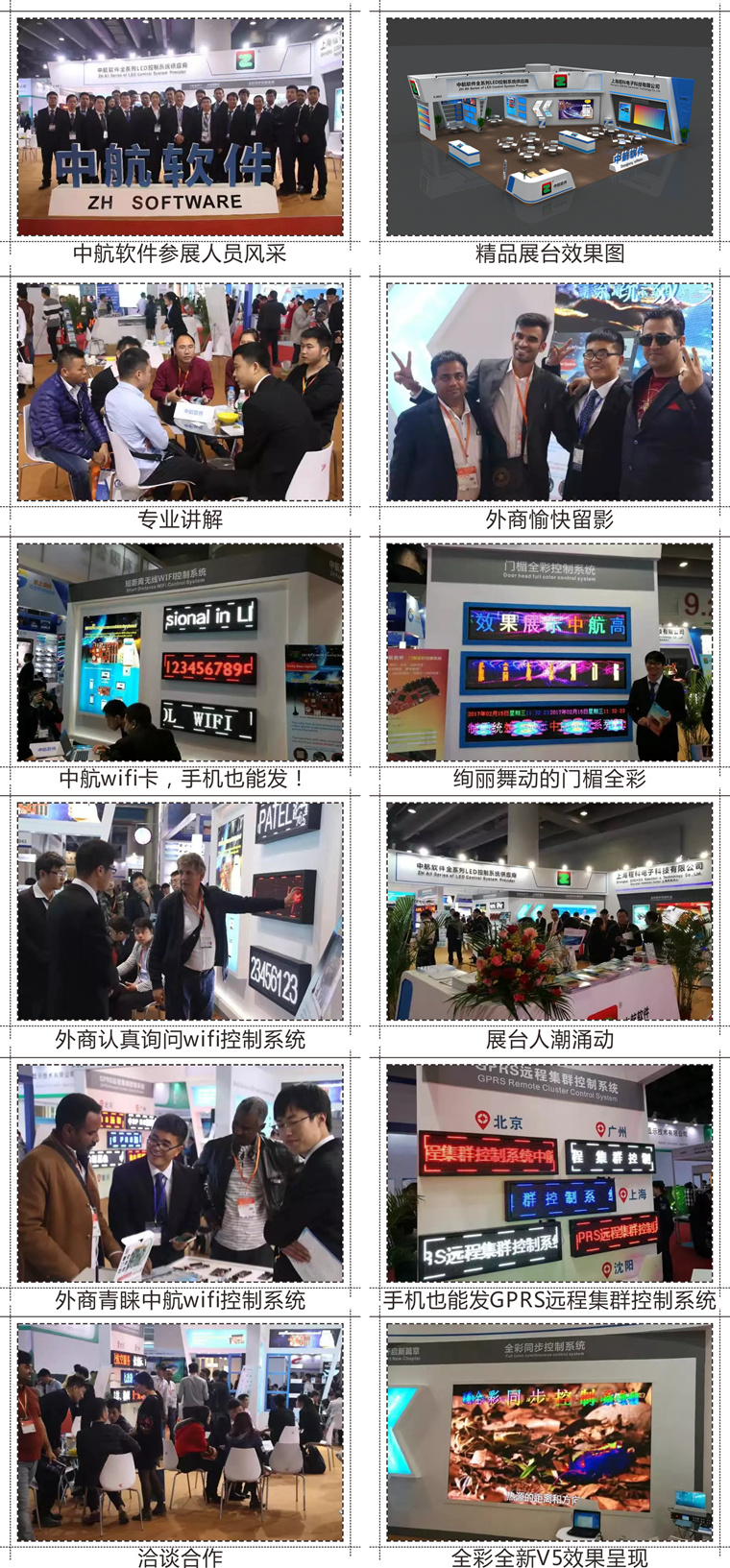 在剛剛過去不久的 2017廣州國際智能廣告標示及LED展覽會 和 2017春季中國中部(鄭州)LED照明展及各地區(qū)展會,中航軟件2017年展示產(chǎn)品系列:全新V5,視頻處理器,全彩同步系列,全彩異步系列,門楣全彩(高、低灰)系列,超長帶載網(wǎng)口卡,全面升級版WIFI系列,GPRS系列,網(wǎng)絡卡系列等。中航軟件全系列LED控制系統(tǒng)紛呈璀璨,吸引八方賓朋駐足、拍照、洽談!